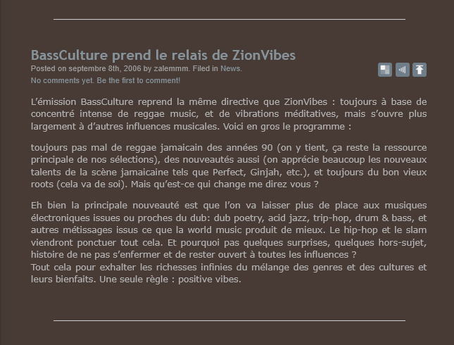 L’émission BassCulture reprend la même directive que ZionVibes : toujours à base de concentré intense de reggae music, et de vibrations méditatives, mais s’ouvre plus largement à d’autres influences musicales. Voici en gros le programme :
